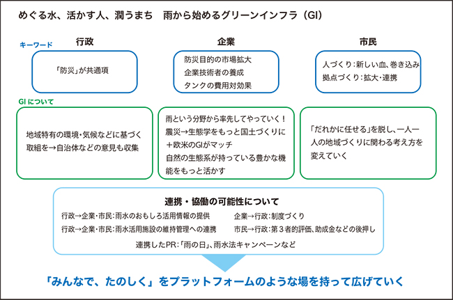 いろいろと意見が出たように、味わうことや雨だれの音など雨をグリーンインフラに活用して五感で感じる暮らし、まちづくりをしていくことが今回のテーマに返っていくのではないか。
