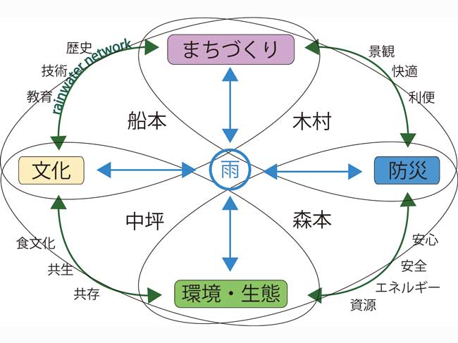 大会では防災と環境まちづくりの両面から考えるので、両方の呼び方が混在している。 - ・「雨庭」の発想は、小規模分散型の雨水活用とそのネットワークによって、経済・社会・環境の課題を同時解決